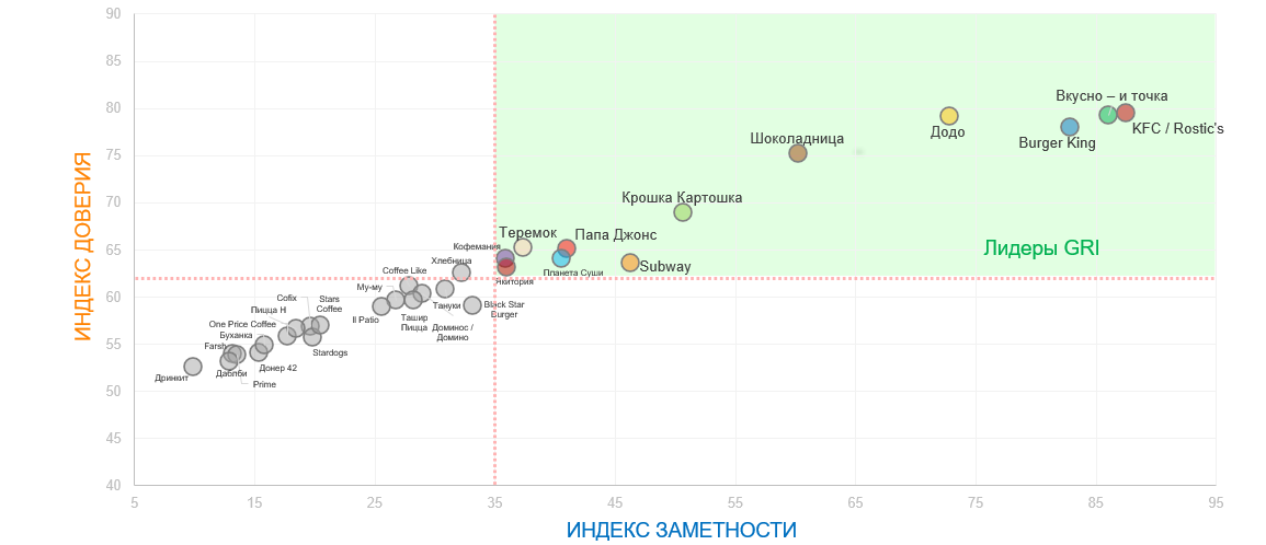 Говоря о рынке общественного питания в целом, стоит отметить, что сети быстрого питания Вкусно – и точка, KFC/Rostic’s и Burger King образуют тройку лидеров по индексам заметности и доверия. На одном уровне с ними по уровню доверия находится сеть пиццерий Додо, но уступает по показателю заметности. В группу популярных заведений также входят: Шоколадница, Крошка Картошка, Subway, Папа Джонс, Теремок, Планета Суши, Якитория и Кофемания. В целом, чем лучше население знает заведение, тем больше ему доверяет.