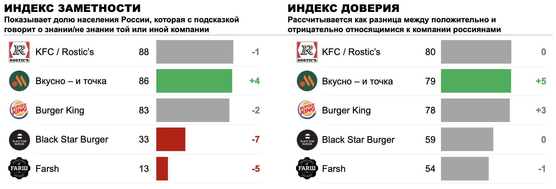 Вкусно – и точка – единственная компания, которой удалось за год нарастить и индекс заметности, и индекс доверия. Показатели индексов KFC / Rostic’s и Бургер Кинга остались на уровне прошлого года. Заметное снижение индекса заметности наблюдается у Black Star Burger (-7) и Farsh (-5) при сохранившемся уровне доверия.