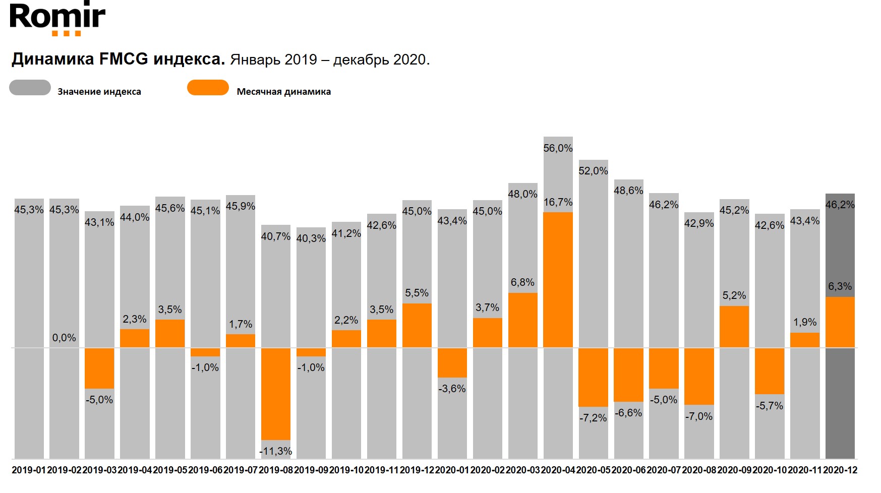«В декабре доля расходов на FMCG традиционно выросла. Это сезонный фактор, отражающий подготовку россиян к празднованию Нового года. При этом, против декабря прошлого года рост приблизительно равен среднегодовому. В целом индекс демонстрировал довольно сильный рост в этом году, но с учетом пандемии коронавируса это было вполне ожидаемо», – комментирует исполнительный директор «Ромир» и Mile Group Инна Караева.