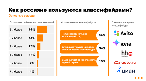 Исследование Ромир показало, что 94% россиян пользуются сайтами по размещению объявлений, а большинство из них (около 70%) одновременно используют разные классифайды. При этом 41,3% использует три и более классифайда, а около четверти (23,1%) — четыре и более. Только 15% россиян было бы удобно использовать единый сайт для размещения объявлений.