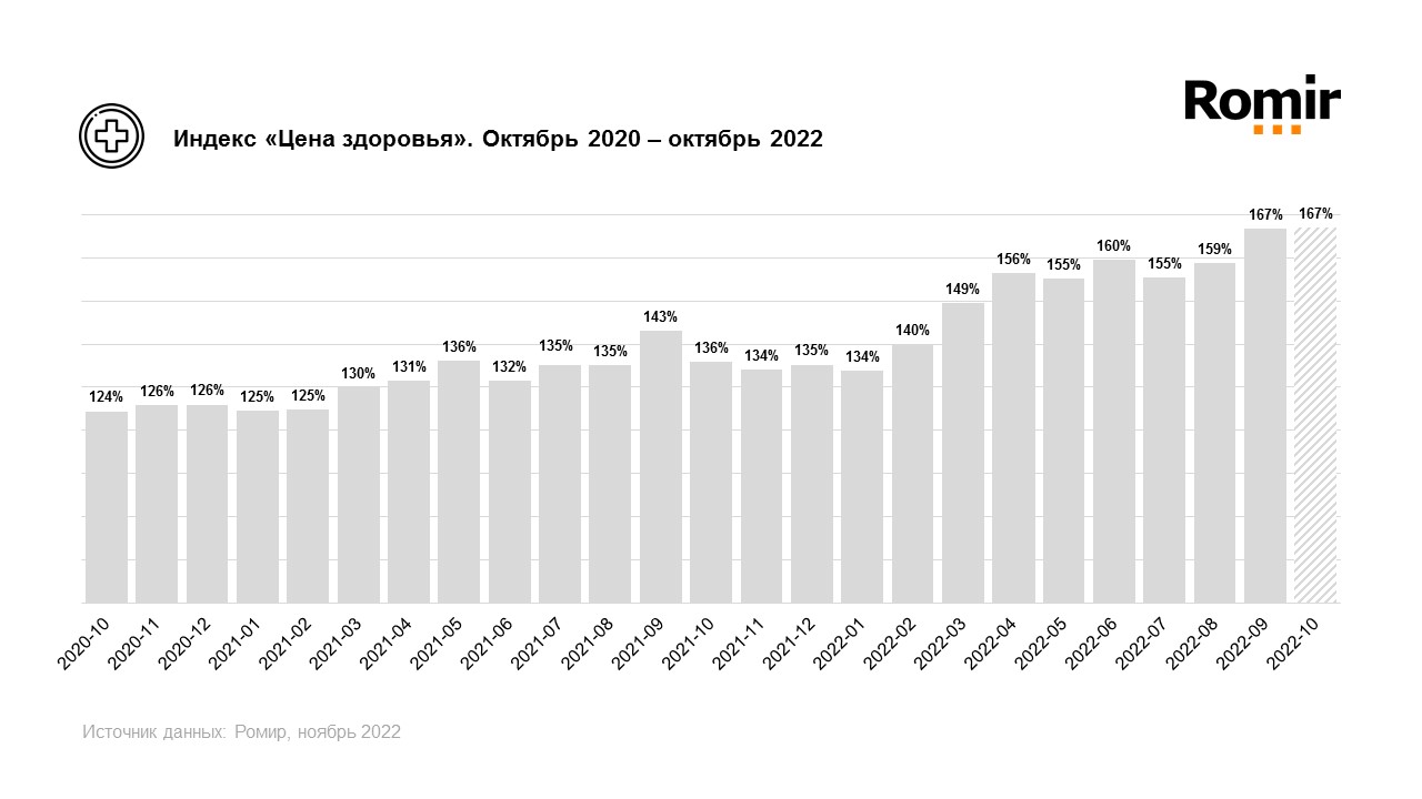 В октябре цены на лекарства стабилизировались после сентябрьского роста и увеличились лишь на 0,2% за месяц. Индекс «Цена здоровья» в октябре составил 167%.