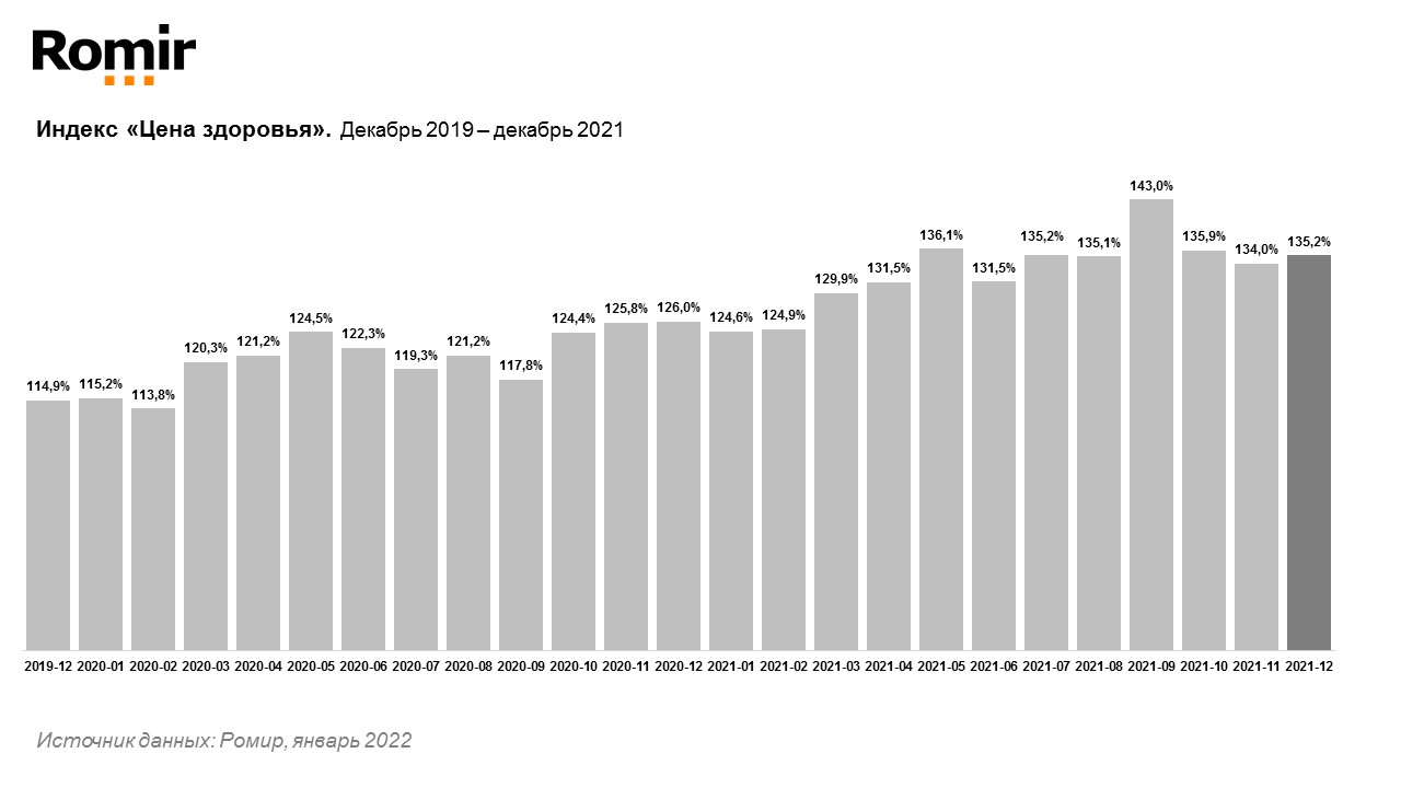 В конце 2021 года цены на лекарственные препараты выросли на 1% по сравнению с ноябрем. Индекс «Цена здоровья» составил 135,2%. По сравнению с декабрем 2020 года показатель увеличился на 7% (9,2 п.п.). Показатель января 2019 года принят за 100% – исходную точку для расчета индекса.