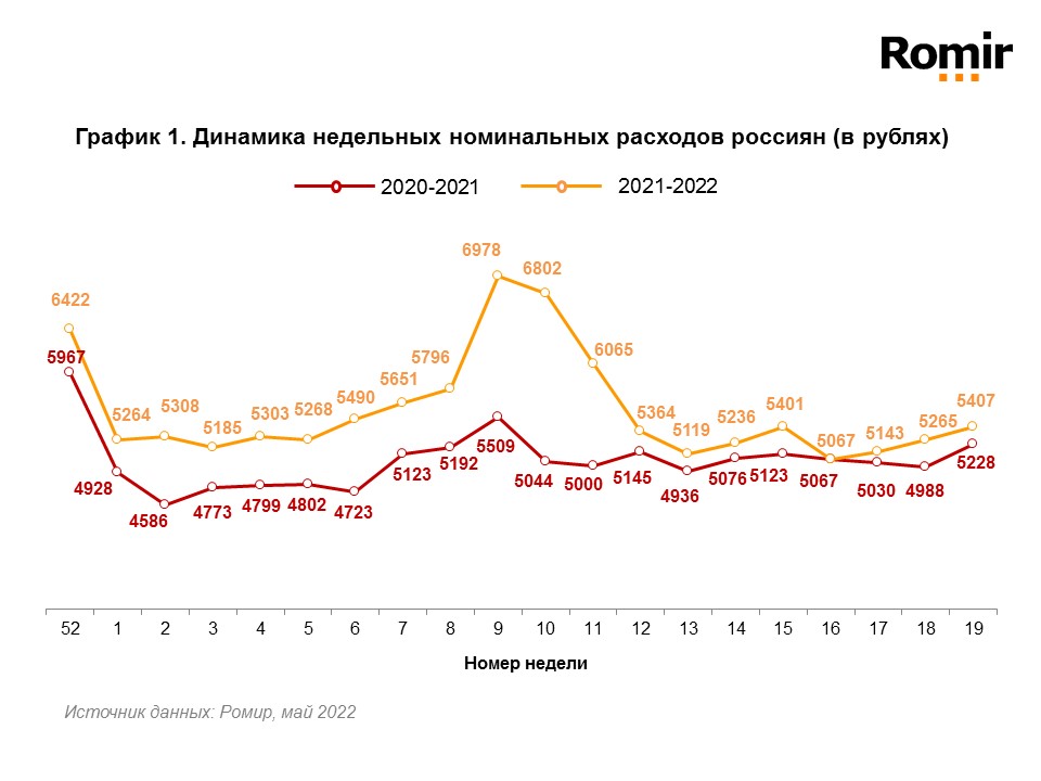В период с 9 по 15 мая средние недельные расходы россиян увеличились на 2,7% по сравнению с предшествующей неделей. Индекс недельных расходов составил 5 407 рублей. В годовой динамике расходы выросли на 3,4%. Относительно среднего значения за последние 12 месяцев (5 313 рублей) индекс недельных расходов выше на 1,8% или 94 рубля.