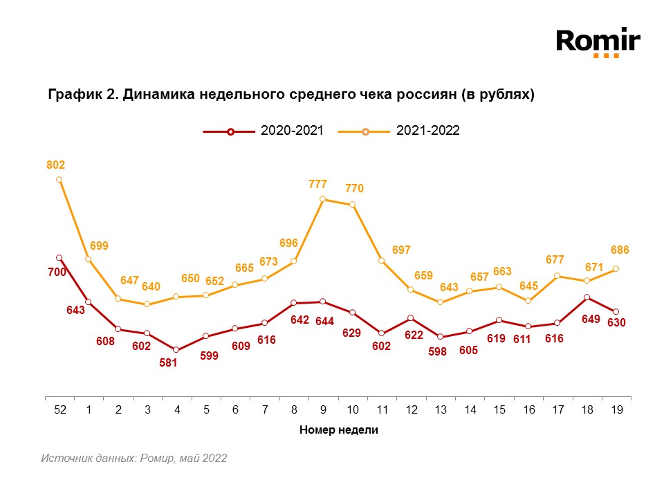 Индекс среднего чека по сравнению с предшествующей неделей увеличился на 2,2%. Средняя стоимость одной покупки составила 686 рублей. По сравнению с аналогичным периодом прошлого года индекс показывает рост на 8,9%. Относительно среднего значения за последние 12 месяцев (659 рублей) недельный чек выше на 4,1%.