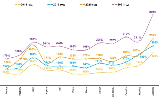 Согласно результатам панельного исследования Romir Consumer Scan Panel* в декабре 2021 года индекс повседневных номинальных (без поправки на инфляцию) расходов россиян составил 259%, что на 48 п.п. больше, чем в ноябре. Относительно аналогичного периода в 2020 году (216%) индекс увеличился на 43 п.п.