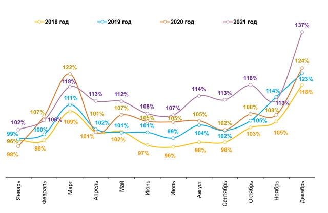 Реальные расходы выросли по сравнению с предыдущим месяцем (+24 п.п.) и в годовой динамике (+13 п.п.). В декабре 2021 года индекс покупательской активности составил 137%.