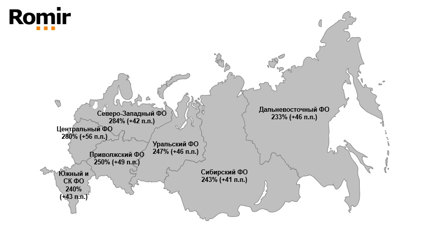 В месячной динамике расходы выросли равномерно по России. Выделяется только Центральный федеральный округ с индексом покупательской активности 280%, который показал наибольший рост – 56 п.п.