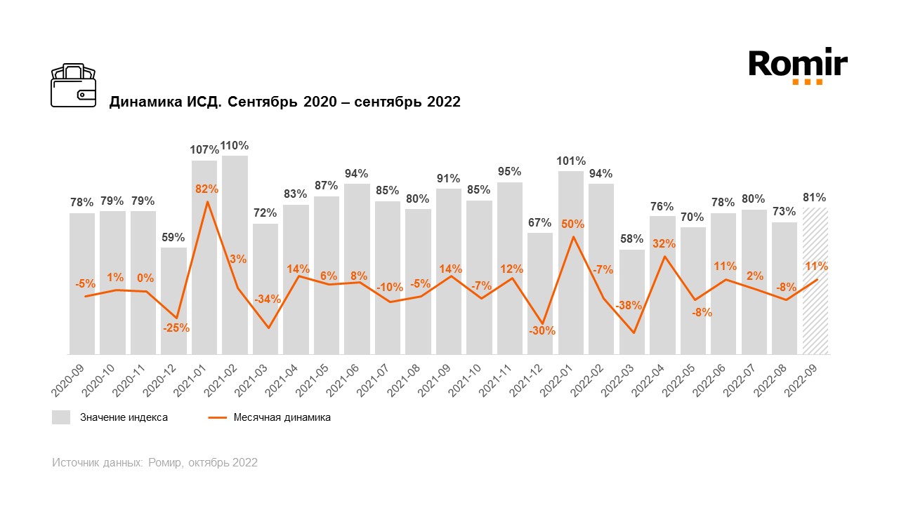 Индекс свободных денег составил 81%, что по сравнению с предшествующим месяцем больше на 11% (8 п.п.). По отношению к сентябрю 2021 года (ИСД – 91%) индекс сократился на 11% (10 п.п.).