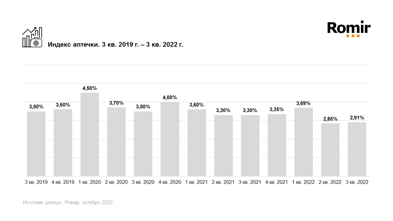 В третьем квартале 2022 года Индекс аптечки сохранил низкий показатель – 2,91%. Несмотря на сезональный рост против прошлого квартала на 2,1%, индекс остается на крайне низком уровне. По сравнению с аналогичным периодом прошлого года индекс сократился на 11,8%