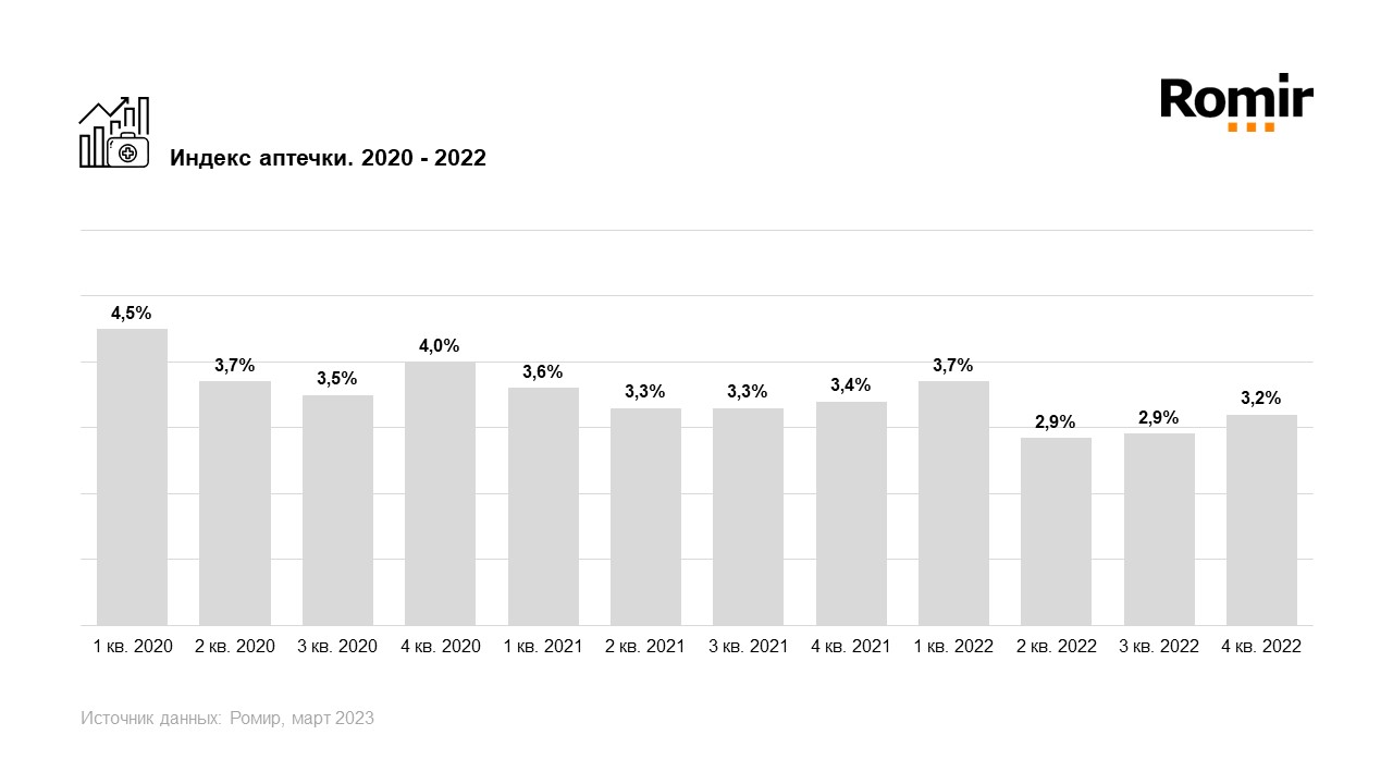 Исследовательская компания «Ромир» представляет результаты ежеквартального «Индекса аптечки». Он демонстрирует динамику доли затрат россиян на медицинские товары, а основой для расчета являются чеки о покупках в «Единой панели данных».