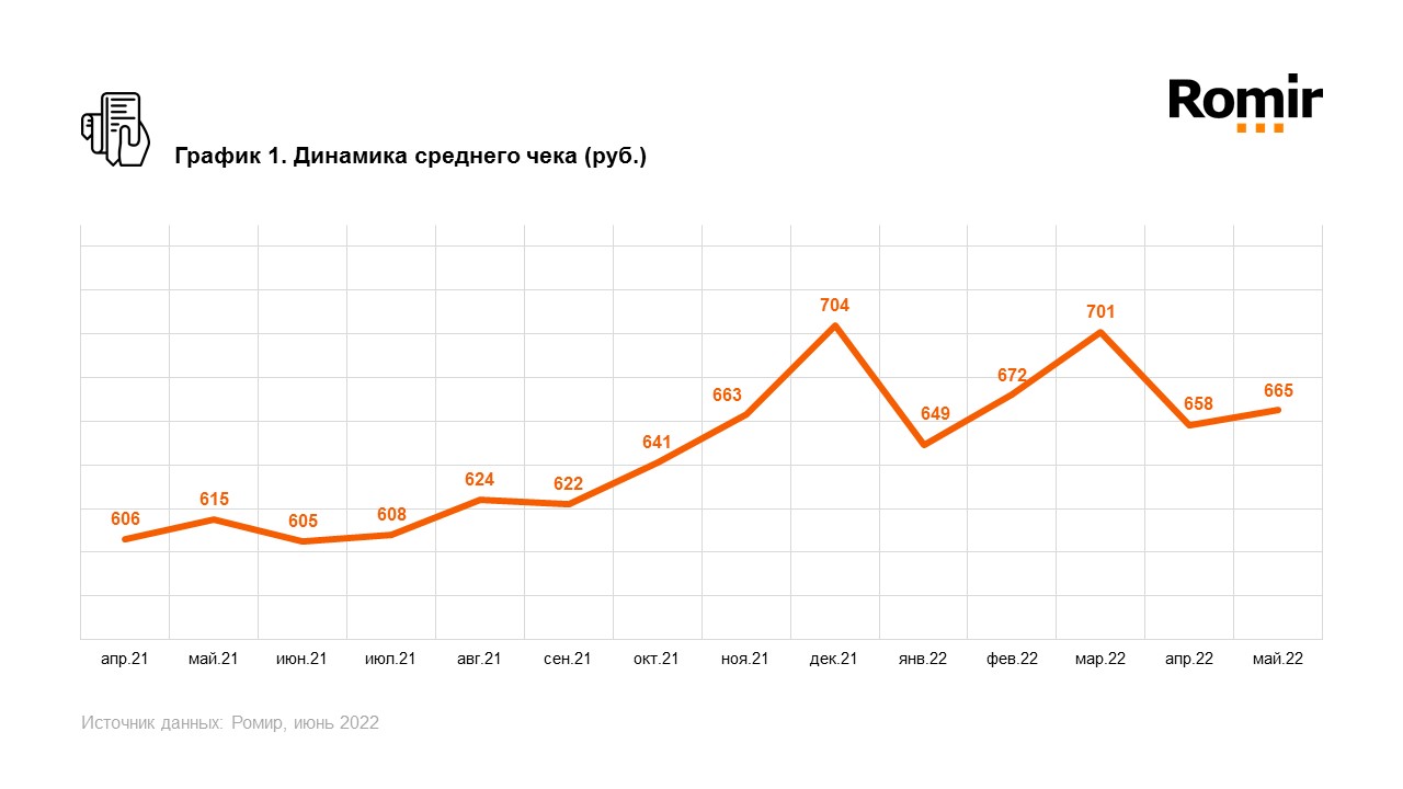 В рамках исследования потребительского поведения Ромир рассчитал индекс среднего чека (индекс среднего значения общих покупок и индекс покупок FMCG-товаров) за май 2022 года.