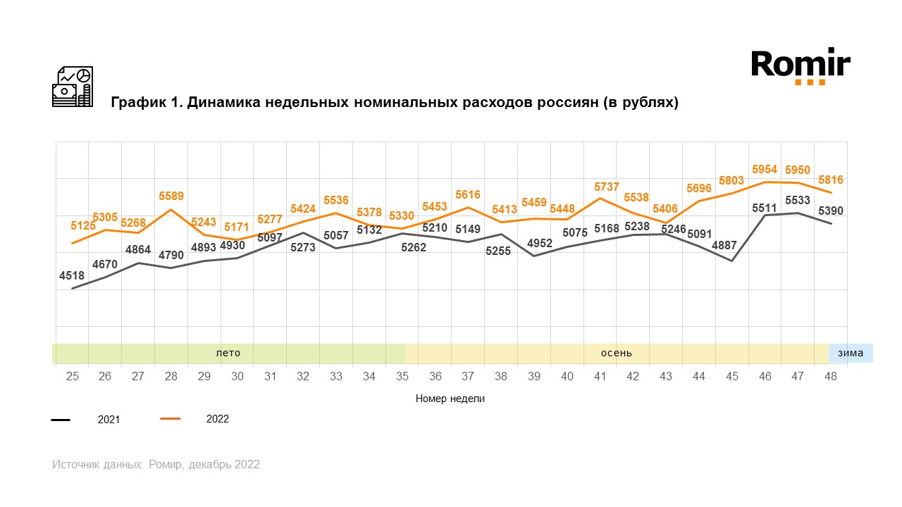 В период с 28 ноября по 4 декабря средние недельные расходы россиян сократились по сравнению с предшествующей неделей на 2,3%. Индекс недельных расходов составил 5816 рублей. В годовой динамике индекс вырос на 7,9%.