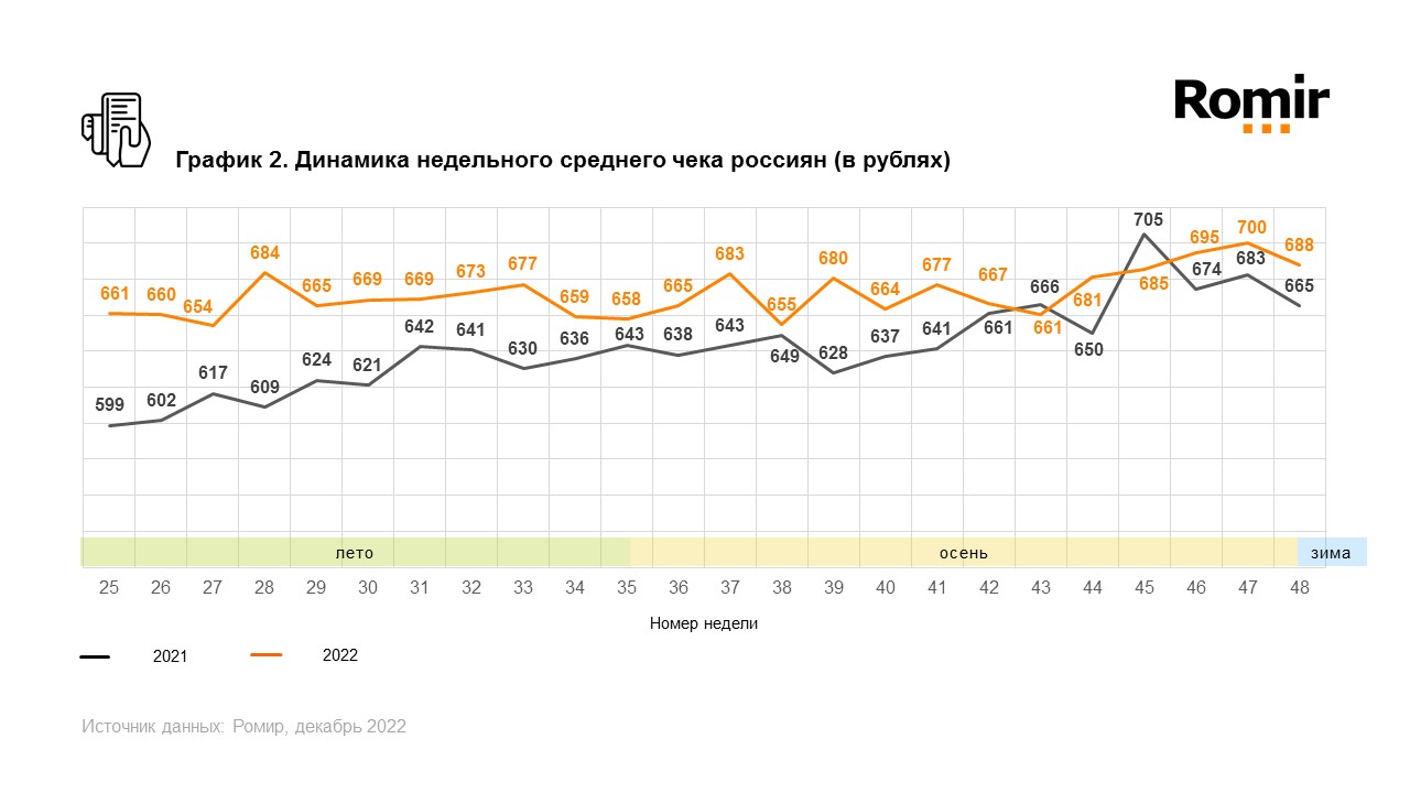 Индекс среднего чека по сравнению с предшествующей неделей сократился на 1,7% и в денежном выражении составил 688 рублей. По сравнению с аналогичным периодом прошлого года средний чек выше на 3,5%.