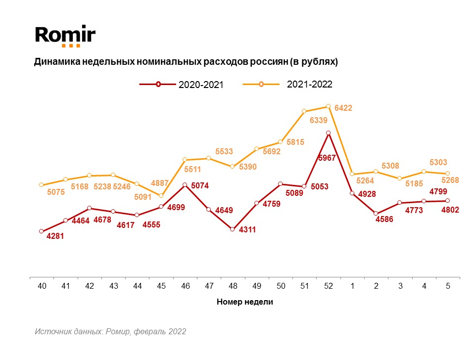 Относительно среднего значения за последние 12 месяцев (5 166 рублей) индекс недельных расходов выше на 1,9% или 102 рубля.