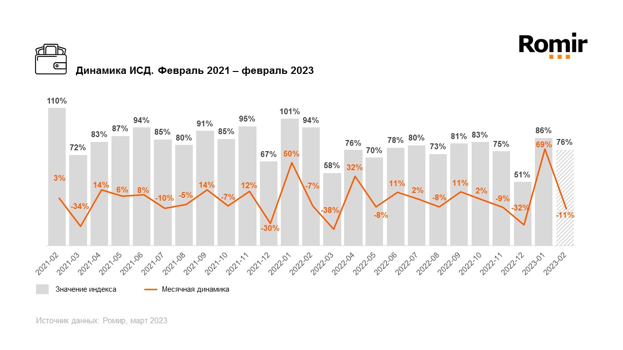 Индекс свободных денег составил 76%, что по сравнению с предшествующим месяцем меньше на 11% (10 п.п.). По отношению к февралю 2022 года (ИСД – 94%) индекс ниже на 19% (18 п.п.).