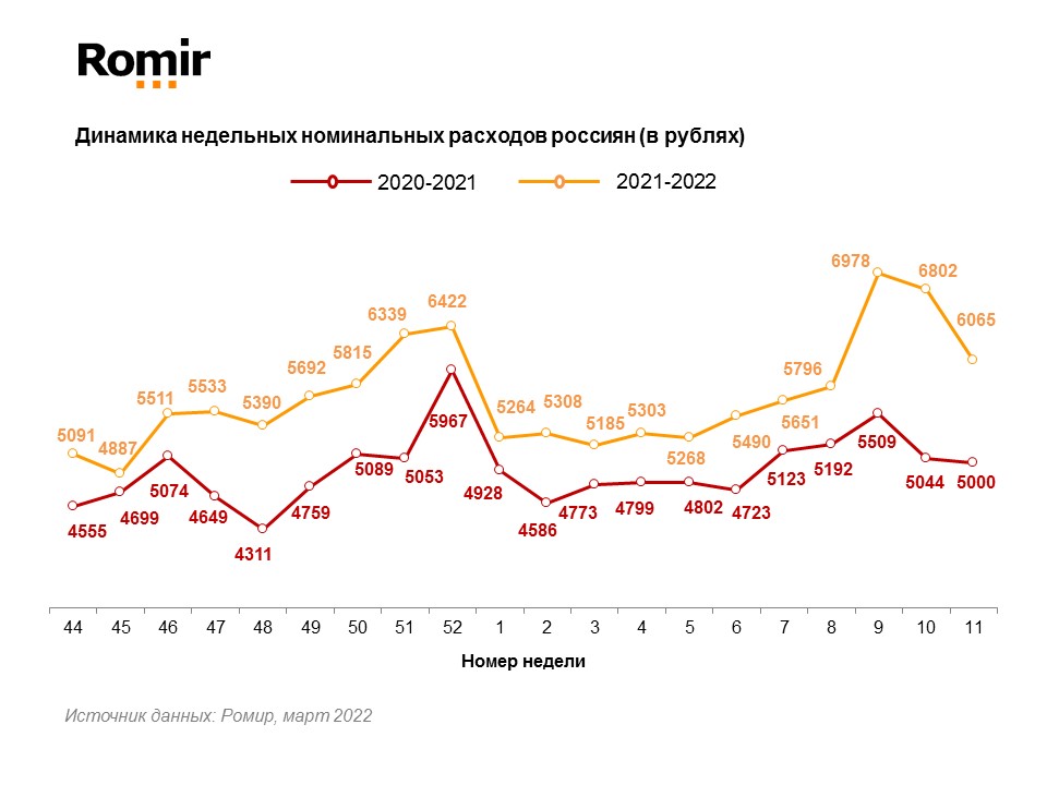 Относительно среднего значения за последние 12 месяцев (5 285 рублей) индекс недельных расходов выше на 14,8% или 780 рублей.