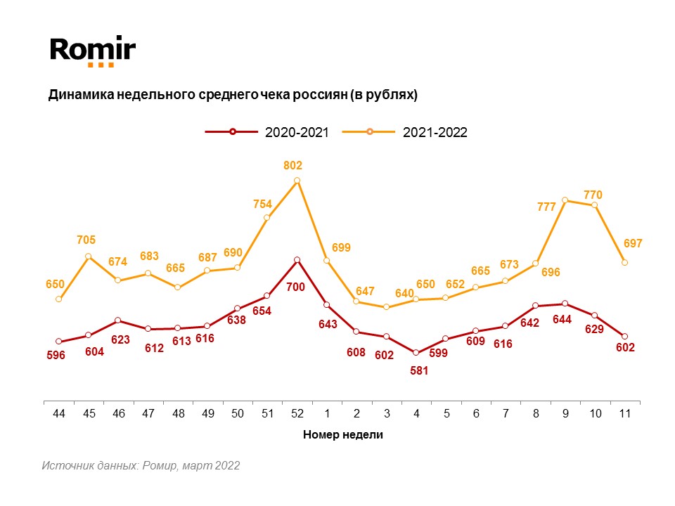 Относительно среднего значения за последние 12 месяцев (652 рубля) недельный чек выше на 6,9% или 45 рублей.