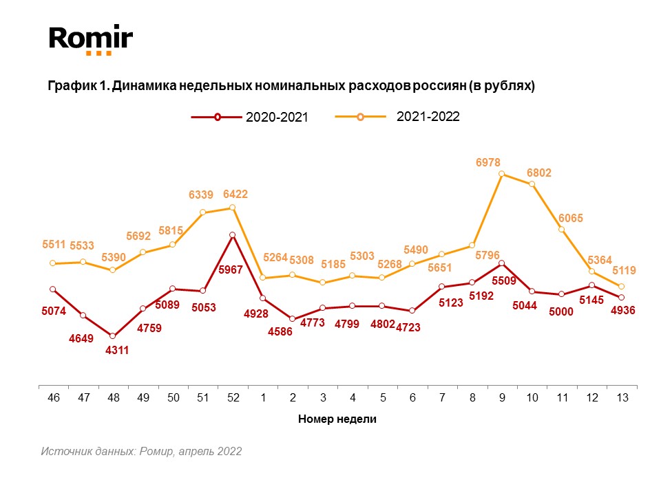 Индекс недельных расходов составил 5 119 рублей, что на 4,6% (245 рублей) меньше, чем на предшествующей неделе.