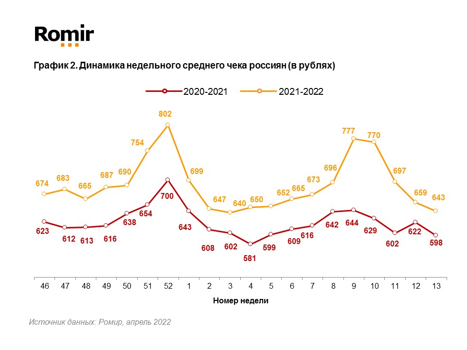 Относительно среднего значения за последние 12 месяцев (655 рублей) недельный чек ниже на 1,8% или 12 рублей.