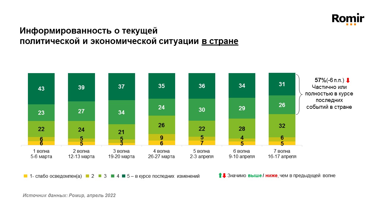 Седьмая волна исследования показала, что 57% россиян частично или полностью в курсе последних событий в стране. За неделю показатель снизился почти на 10%. Доля тех, кто нейтрально оценивает свою информированность достигла самого высокого значения за семь недель.