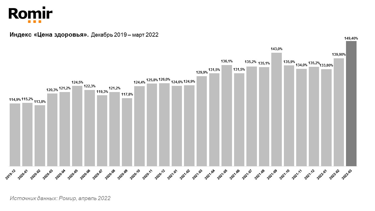 В марте цены на лекарственные препараты выросли на 7% по сравнению с февралем. Индекс «Цена здоровья» составил 149,4%. По сравнению с мартом 2021 года показатель увеличился на 15%.
