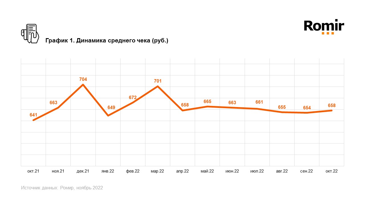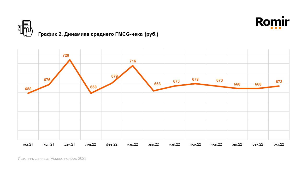 Средний чек FMCG-покупок в октябре составил 673 рубля, что выше на 0,8% (5 рублей), чем в сентябре. За год показатель вырос на 2,3% (15 рублей).