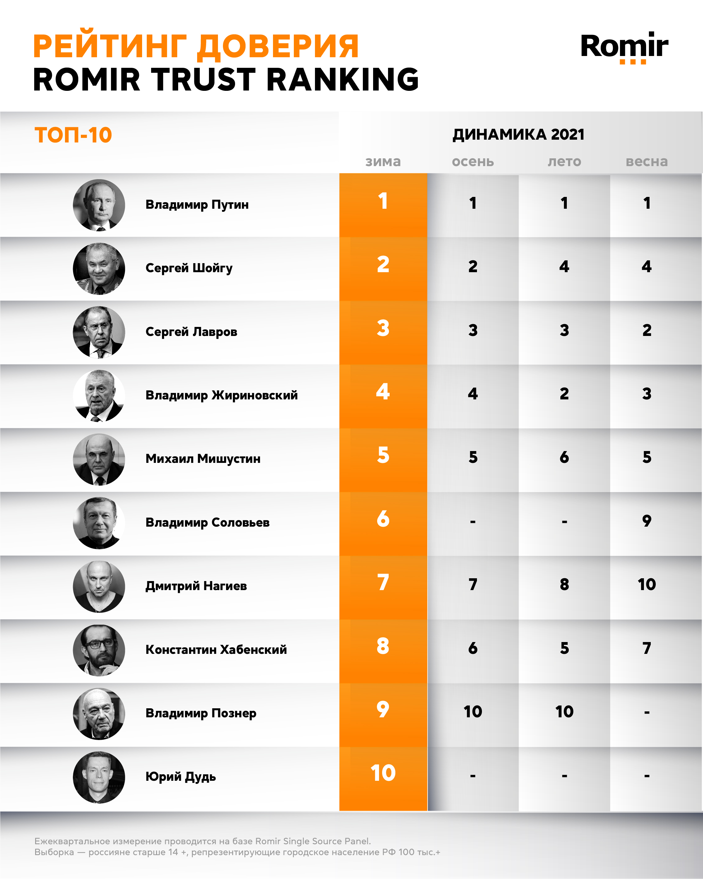 Исследовательский холдинг Ромир выяснил, кому из публичных личностей доверяют россияне в начале этой зимы, и определил топ-10 лидеров. Исследование Romir Trust Ranking проводится несколько лет, что позволяет рассмотреть рейтинг в динамике.