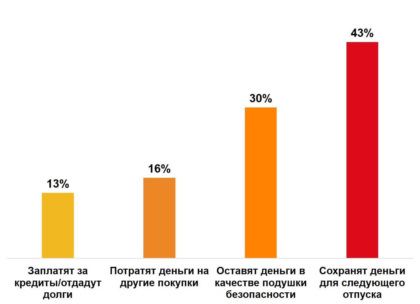 Кроме того, говоря о будущем, почти половина (43%) россиян сохранит деньги для следующего отпуска, ведь в связи с последними событиями некоторым пришлось его отменить (18%). Треть респондентов (30%) оставит неиспользованные для отпуска деньги в качестве подушки безопасности на будущее. 16% потратят на другие покупки, а еще 13% заплатят за кредиты или отдадут другие долги.