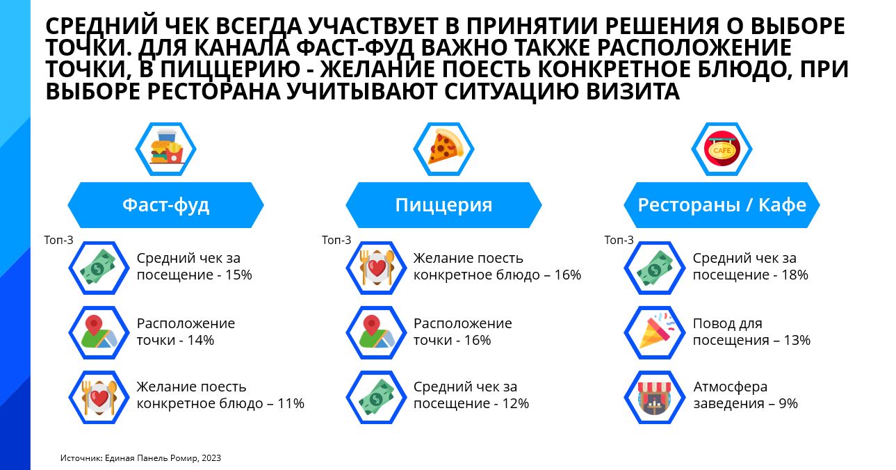 Директор по работе с клиентами Ромир Маргарита Абрамкина приняла участие в экспертной сессии «Horeca & Retail: форматы коллабораций общественного питания, розничной торговли и сферы услуг». В своем выступлении она поделилась данными о том, что посетители заведений общественного питания имеют различные мотивации и критерии при выборе места для посещения. Одним из важнейших критериев является средний чек, рассказала Маргарита Абрамкина. Его уровень учитывается как в кафе и ресторанах, так и в пиццериях и в фаст-фуд заведениях. Каналу фаст-фуд также важно расположение точки, а в канале пиццерий – желание поесть конкретное блюдо. При этом, в кафе и ресторанах атмосфера заведения и повод для посещения играют важную роль при принятии решения.