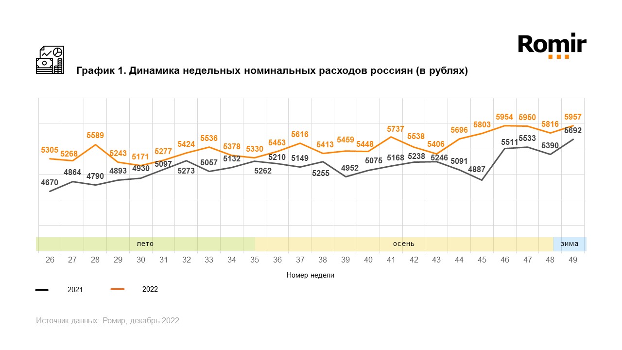 В период с 5 по 11 декабря средние недельные расходы россиян увеличились по сравнению с предшествующей неделей на 2,4%. Индекс недельных расходов в денежном выражении составил 5 957 рублей. В годовой динамике индекс вырос на 4,7%.