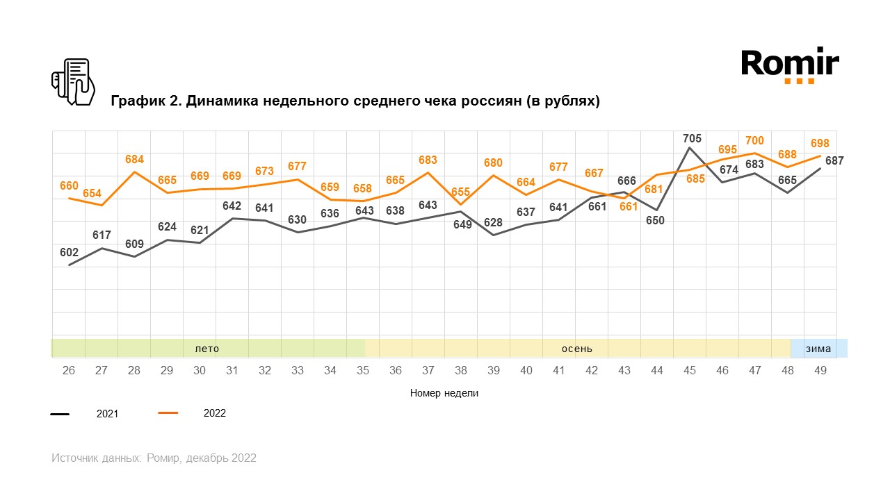 Индекс среднего чека по сравнению с предшествующей неделей увеличился на 1,5% и в денежном выражении составил 698 рублей. По сравнению с аналогичным периодом прошлого года средний чек выше на 1,6%.