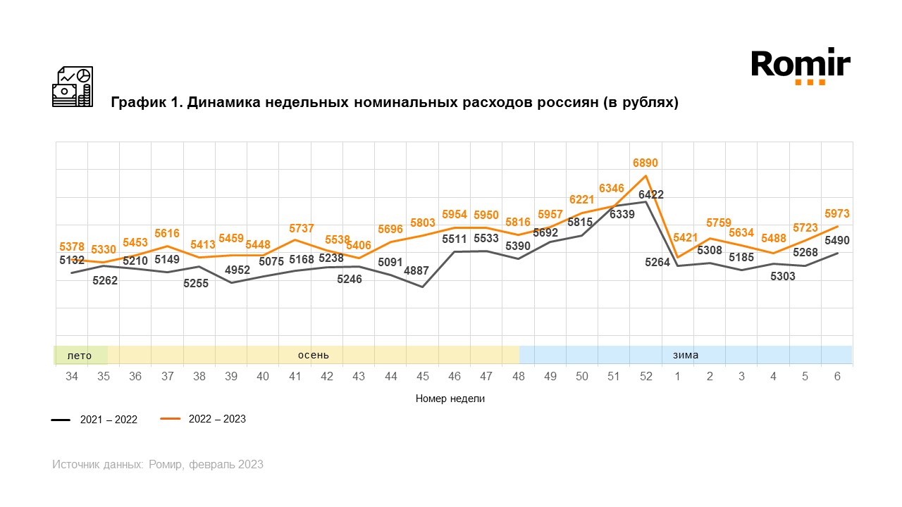 В период с 6 по 12 февраля средние недельные расходы россиян выросли по сравнению с предшествующей неделей на 4,4%. Индекс недельных расходов составил 5 972,7 рубля. В годовой динамике индекс вырос на 8,8%.