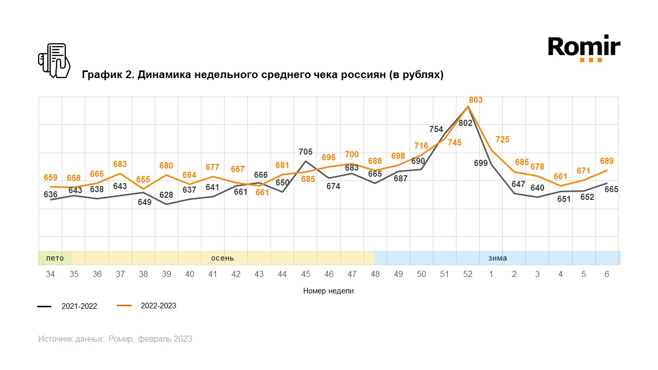 ИНСЧ (индекс недельного среднего чека) исследовательского холдинга Ромир показывает динамику стоимости покупок домохозяйств и рассчитывается для каждой календарной недели на основе данных Единой панели данных Ромир.