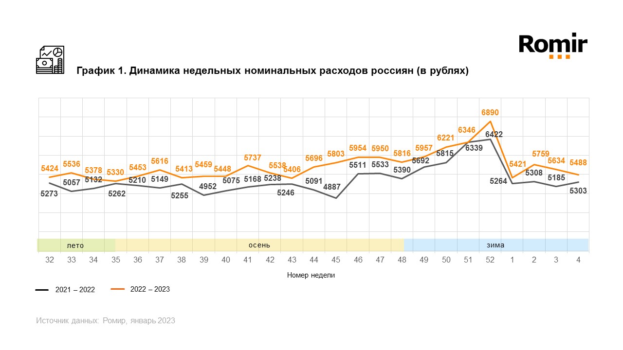 В период с 23 по 29 января средние недельные расходы россиян сократились по сравнению с предшествующей неделей на 2,6%. Индекс недельных расходов составил 5 487,8 рублей. В годовой динамике индекс вырос на 3,5%.