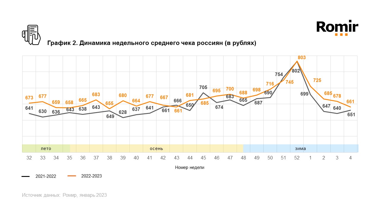 ИНСЧ (индекс недельного среднего чека) исследовательского холдинга Ромир показывает динамику стоимости покупок домохозяйств и рассчитывается для каждой календарной недели на основе данных Единой панели данных Ромир.