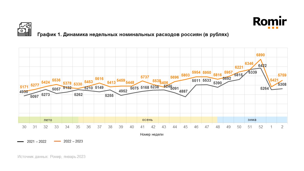 В период со 9 по 15 января средние недельные расходы россиян увеличились по сравнению с предшествующей неделей на 6,2%. Индекс недельных расходов составил 5 759 рублей. В годовой динамике индекс вырос на 8,5%.
