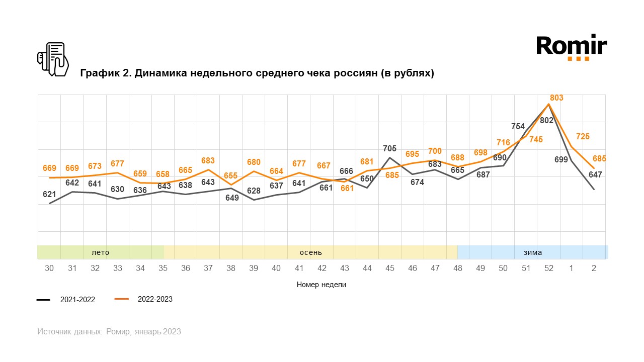 ИНСЧ (индекс недельного среднего чека) исследовательского холдинга Ромир показывает динамику стоимости покупок домохозяйств и рассчитывается для каждой календарной недели на основе данных Единой панели данных Ромир.