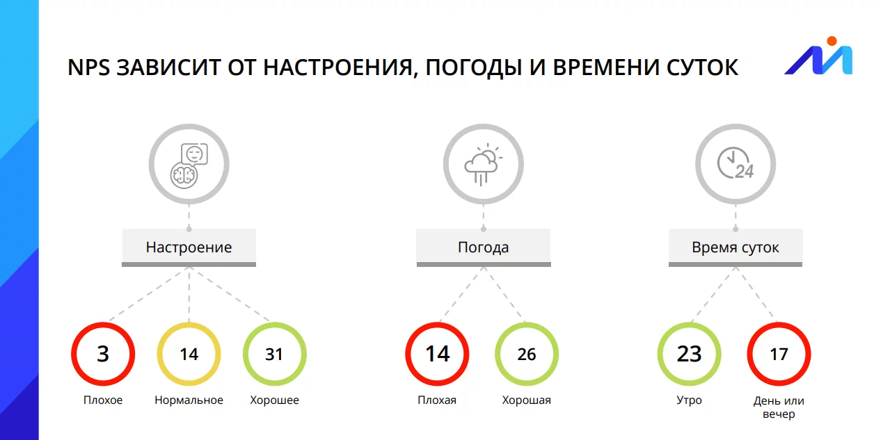 Исследование Ромир, проведенное в марте 2023 года, показало, что на уровень лояльности клиентов к деятельности компаний серьезно влияют внешние факторы, такие как погода за окном, настроение респондентов и даже время суток, в которое они проходили опрос. Так, при хорошей погоде значение индекса было почти в два раза выше, чем при плохой. Утреннее время также оказалось более благоприятным для получения высокого показателя – в 1,4 раза больше, чем днем или вечером. Кроме того, пребывание респондентов в хорошем настроении увеличивало NPS в 10 раз.