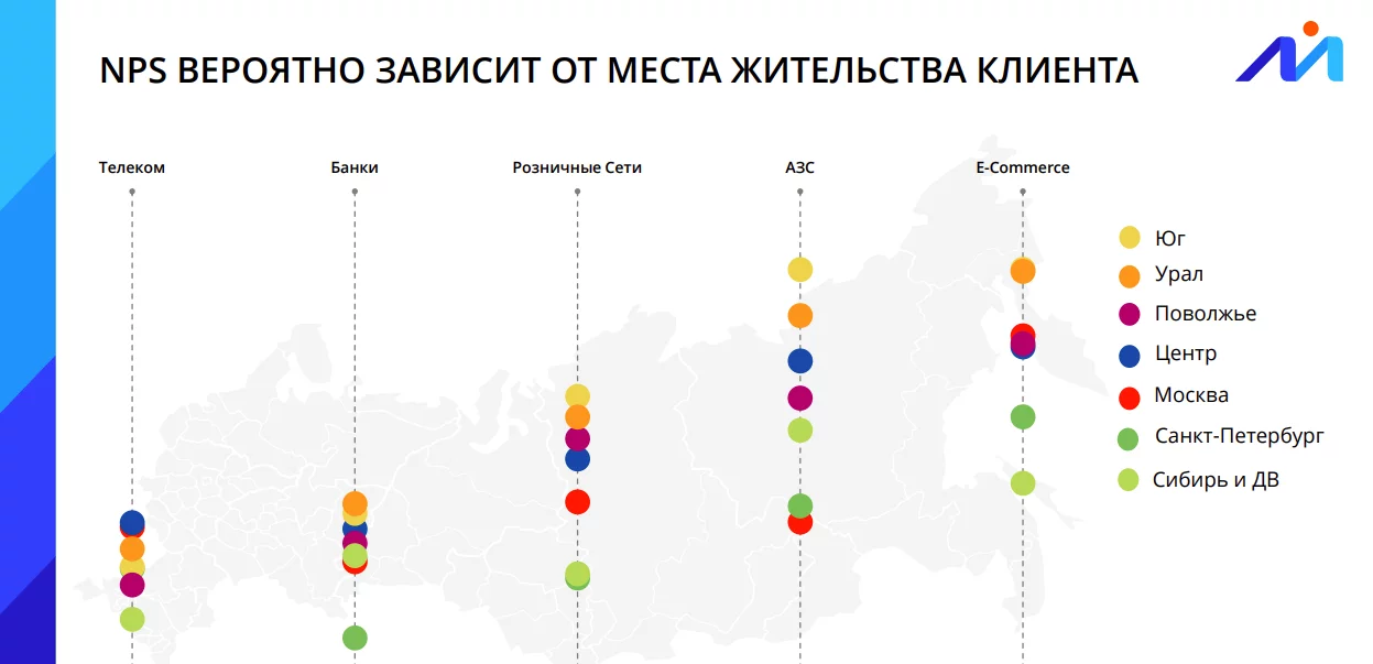 Также в ходе исследования было установлено, что NPS скорее зависит (чем не зависит) от места жительства клиентов: люди, проживающие в южных регионах и на Урале склонны в большей степени хорошо отзываться и рекомендовать что-либо, по сравнению с жителями Сибири и Северо-Западной части страны.