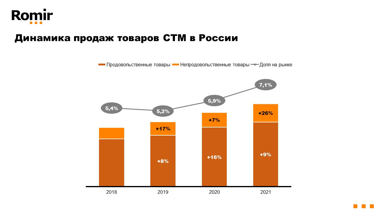 Товары собственных торговых марок розничных сетей (СТМ) продолжают набирать популярность в России. Согласно исследованию Ромир 79% россиян отличают на полках магазинов товары собственных торговых марок от других брендов. В среднем 46 раз в год покупатель выбирает товары СТМ.