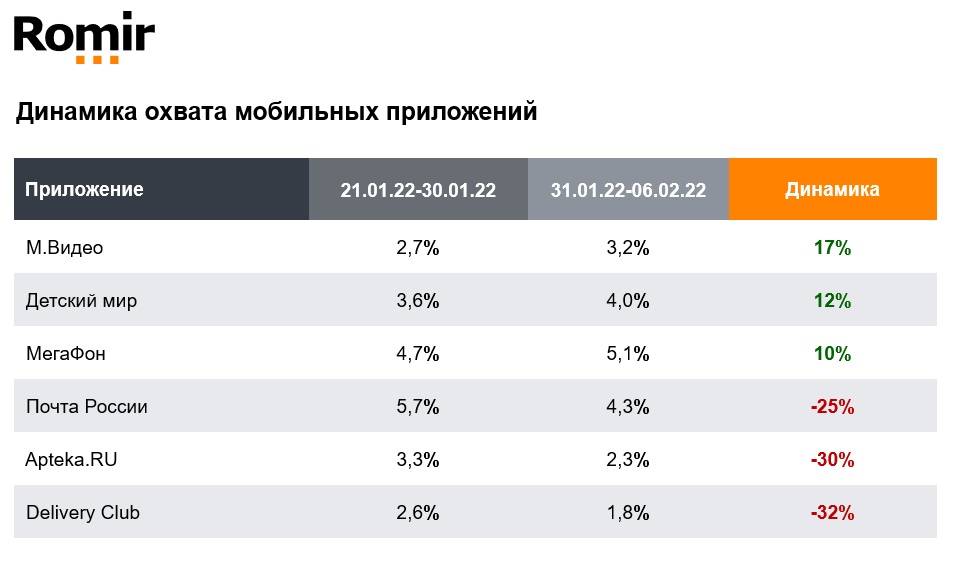 Значительно снизился охват приложений DeliveryClub (-32%), Apteka.RU (-30%) и «Почта России» (-25%).