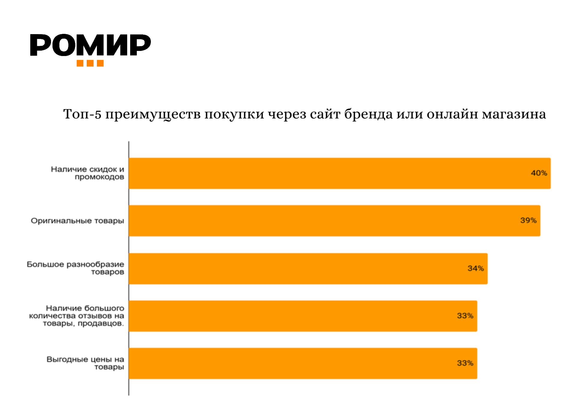 Исследовательский холдинг РОМИР проанализировал поведение покупателей в Интернете. Аналитики выяснили, что доля онлайн-покупателей, предпочитающих приобретать товары на сайтах интернет-магазинов, растет с увеличением стоимости категорий товаров. Среди основных преимуществ покупки через сайт — наличие скидок и промокодов, оригинальные товары, широкий ассортимент и большое количество отзывов, безопасная сделка и более низкие цены по сравнению с другими площадками.