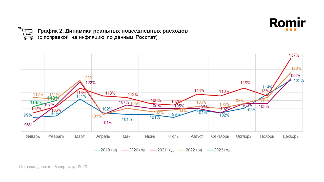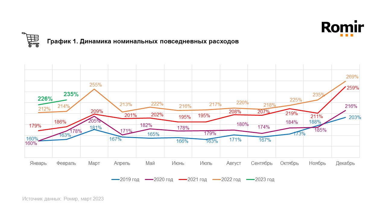 Согласно результатам исследования на базе Единой панели данных «Ромир»**, в феврале 2023 года индекс повседневных номинальных (без поправки на инфляцию) расходов россиян составил 235%, что на 9 п.п. (4,0%) больше, чем в январе. В годовой динамике индекс увеличился на 21 п.п. (9,8%).