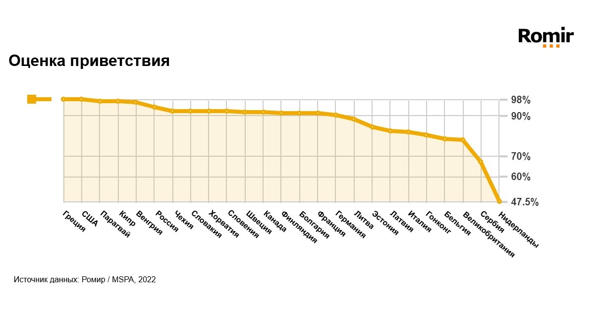 Наивысшую оценку по качеству приветствия получили сотрудники в Греции (98%), за ней следуют США (97,9%) и Парагвай (96,9%). Наименее приветлив оказался персонал в Нидерландах (47,5%) и Сербии (67,3%).