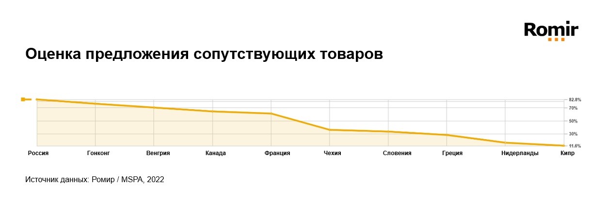 Лучшие результаты по дополнительным продажам показала Российская Федерация (82,8%), Гонконг (76,3%) и Венгрия (70,2%). В конце рейтинга оказались Кипр (11,6%), Нидерланды (16,4%) и Греция (28%).