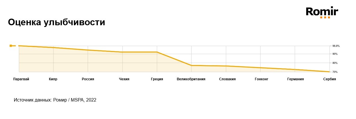 Страны-лидеры по этому показателю – Парагвай (98,8 %), Кипр (96,8 %) и Российская Федерация (94,1 %). Самый низкий индекс улыбки отмечен в Сербии (70 %), Германии (72,6 %) и Гонконге (74,4 %).