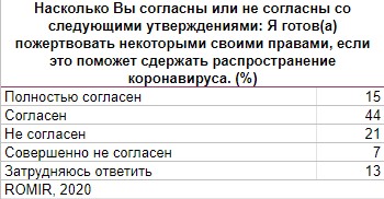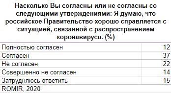 Большинство россиян (49%) считают, российское правительство хорошо справляется с ситуацией, связанной с распространением коронавируса. Кроме того, 59% респондентов готовы пожертвовать некоторыми своими правами, если это поможет сдержать распространение вируса.