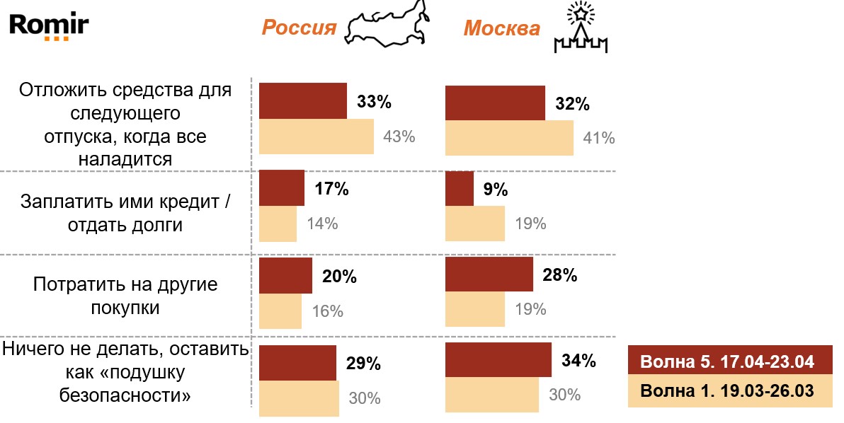 “В том, как меняются планы граждан на деньги, отложенные на отпуск или путешествия, видна оценка текущей экономический ситуации в стране и влияние новостного фона. В условиях разворачивающегося кризиса, многие справедливо считают, что деньги важнее для урегулирования долговых обязательств. С другой стороны, те, кто полагал, что летний период “закрыт”, вновь начинают строить планы на отпуска,” — комментирует итоги мониторинга Ксения Пайзанская, директор по работе с клиентами исследовательского холдинга “Ромир”.
