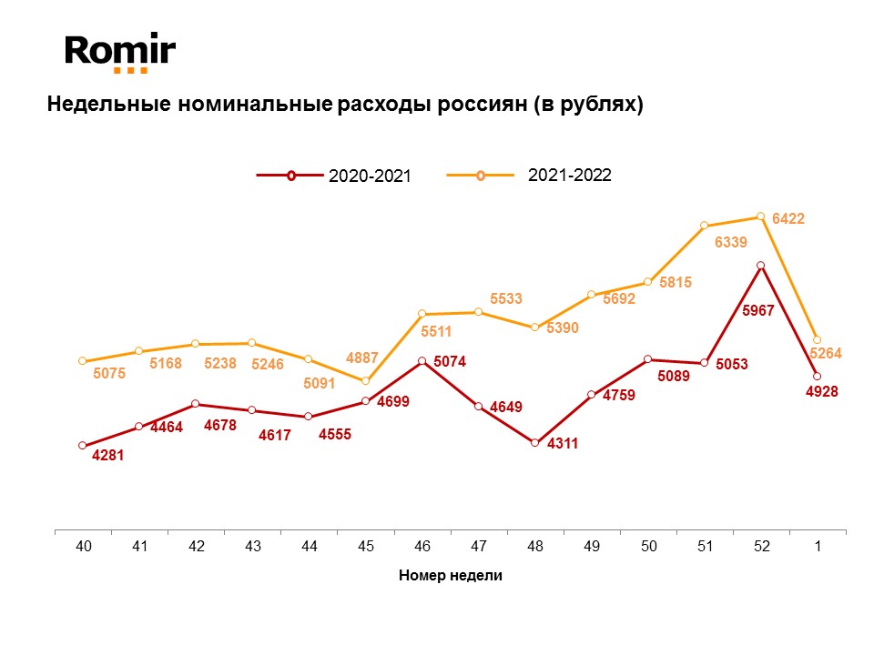 Относительно среднего значения за последние 12 месяцев индекс недельных расходов выше на 3% или 160 рублей.
