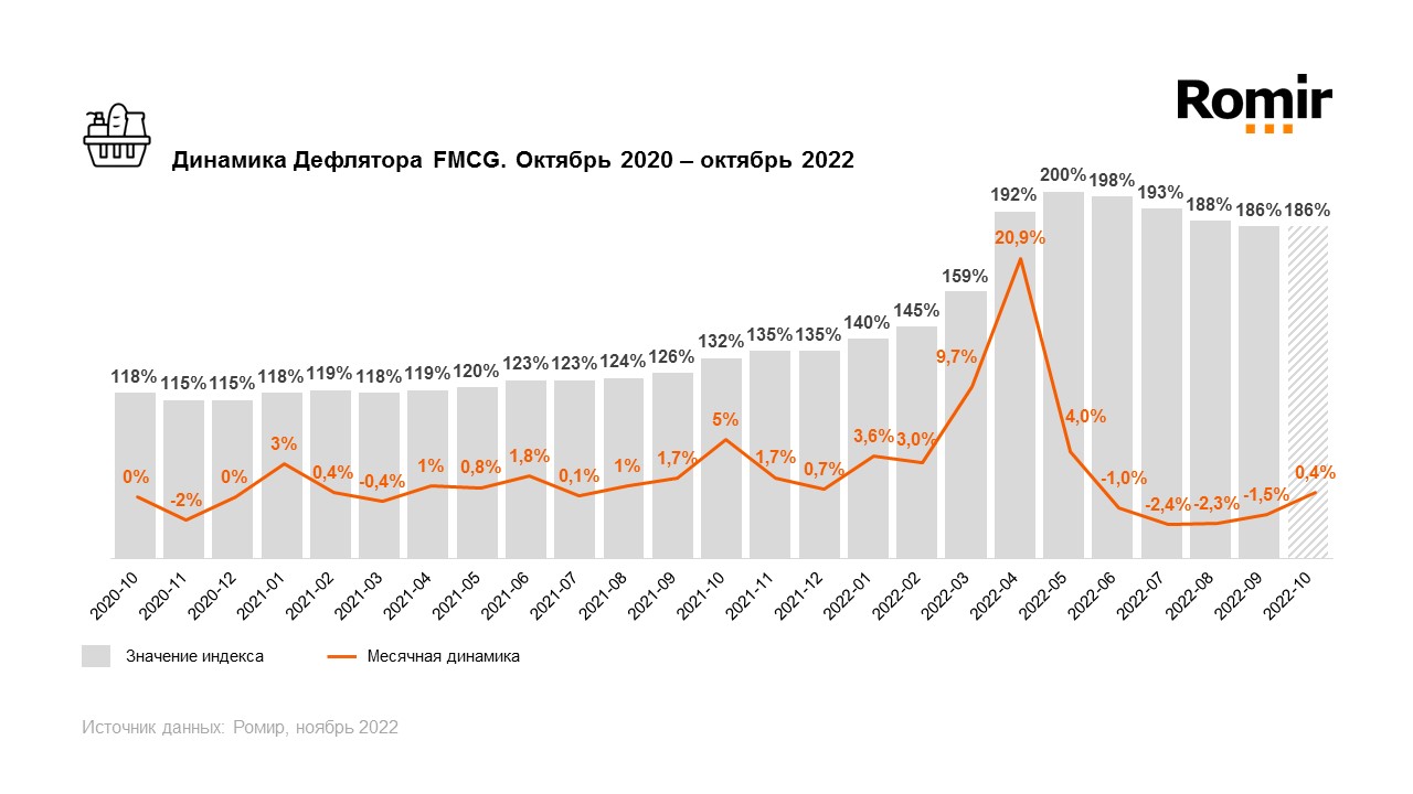 Исследовательский холдинг Ромир продолжает расчет статистического индекса-дефлятора, который отражает фактические изменения общего уровня цен на товары FMCG.